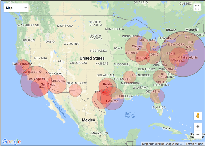 This report places markers on a map based on their address. Google Maps handles addresses flexibly, allowing you to use specific names or locations. This approach produces results similar to the coordinates example. The first column serves as the search criteria, and the second column provides the content for the informational bubbles.