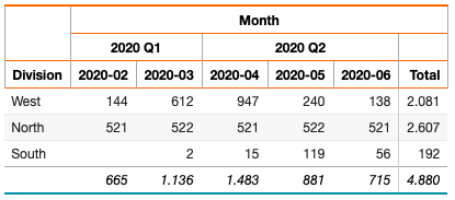 In this example, the months were derived from the fetched data, reflecting their order and actual values. However, if you need to explicitly define all months (1–12) and control the column order, you can do so using the dbr.crosstab.col command.