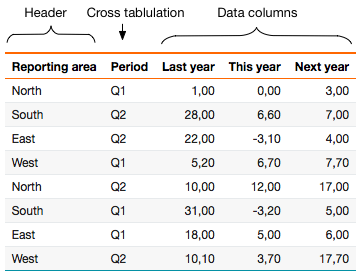 In the context of cross-tabulation, the data in the result set is organized into distinct header and data sections, separated by a designated cross-tabulation column. Header columns, positioned to the left of the cross-tabulation column, determine the unique rows within the final result set. On the right side of the cross-tabulation column, data columns---derived from the cross-tabulation---will be displayed. When using the dbr.crosstab command, you can specify a second parameter to include header columns on both sides of the cross-tabulation data columns.
