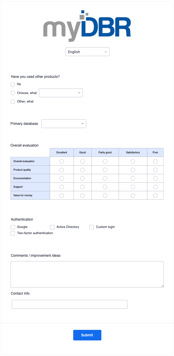 Fields not marked as 'required' are treated as optional. myDBR enforces mandatory selection for the other_products_chosen list only when the associated used_another_product radio button is selected.