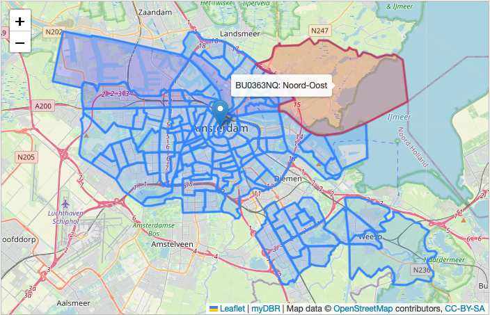 In this example, we use the onEachFeature functionality to invoke a function for every GeoJSON feature (representing neighborhoods in Amsterdam). We add hover effects and create a linked report for each feature using the properties defined in the GeoJSON file.