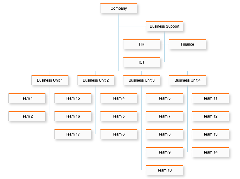 Automatic balancing often results in a wider, shorter chart. For example, a "Business Support" node without siblings might be placed to the left, while other nodes with siblings are placed underneath. This is ideal for organizations where nodes have relatively few siblings.