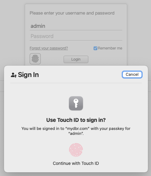 With Passkeys, users can log in without a password, leveraging biometric authentication. When using Passkeys, enabling the 'Remember Me' checkbox on the login screen stores the username in the browser. This prompts myDBR to initiate biometric authentication as soon as the user accesses the login screen.