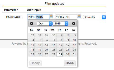 If a report requires a date range (e.g., a start and end date), you can display them on the same row. Enable the Keep the next parameter in the same row option for the first date parameter. myDBR will then include a range selector for common intervals (e.g., last week, last month).