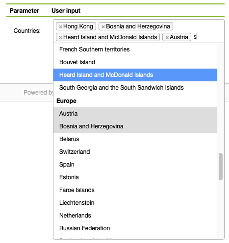 Example of a report filtering by a list of countries (using the MySQL FIND_IN_SET function):