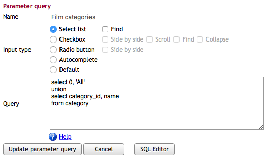 The following example filters a film list based on a category. We use 0 as a special value to display all categories.