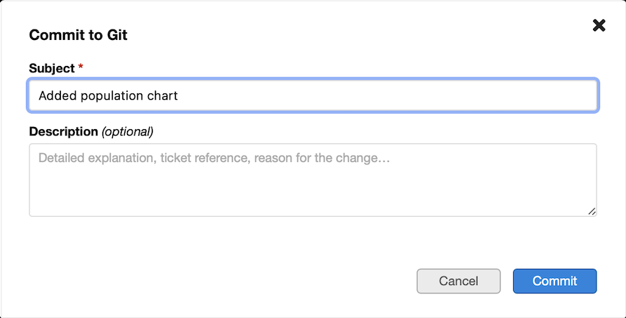 - Commit - opens a dialog to enter a subject and optional description, then saves the current editor content as a new Git commit