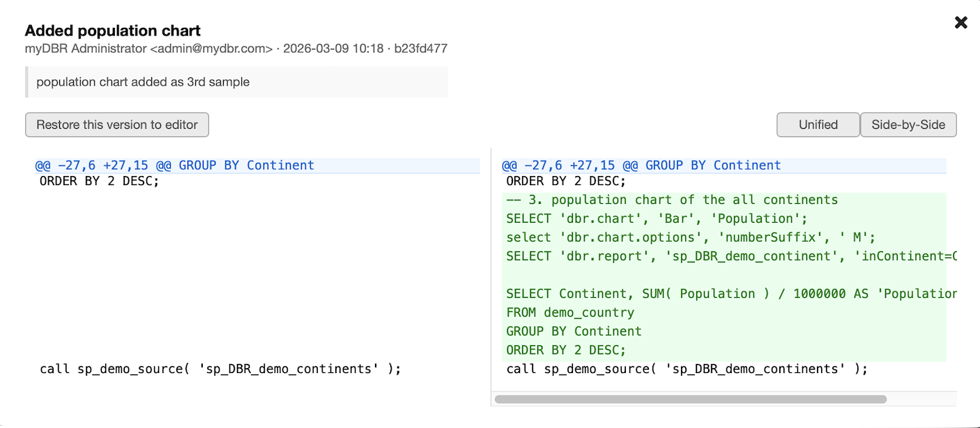 myDBR includes Git integration that lets admin users commit changes to database objects (procedures, functions, views) directly from the SQL editor, and to templates from the template editor. Each save creates a versioned snapshot with the committer's name, email, subject, and optional description, giving you a full audit trail of who changed what and when.